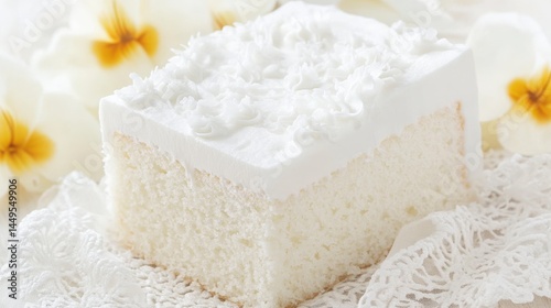 A Slice of Exquisite White Cake with Coconut Icing, Perfect for Any Occasion