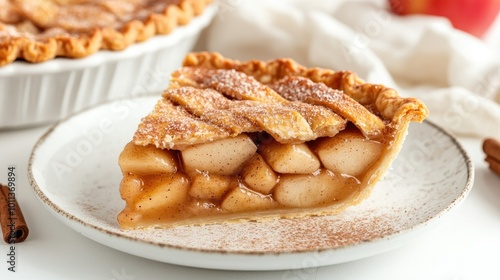A slice of homemade apple pie on a plate, with the cinnamon-sugar filling oozing out, isolated on a white background for a comforting dessert scene.