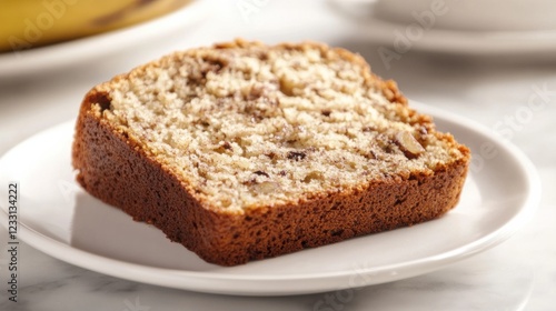 A slice of moist banana bread with walnuts and chocolate chips, placed on a plain white plate, Slice centered with a slightly angled view