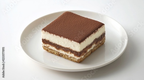 slice, rich, tiramisu, layer, ladyfingers, cream, cocoa, powder, placed, plain, white, plate, centered, angled, view, soft, warm, light, highlighting, texture, colours, clean, elegant, presentation, focusing