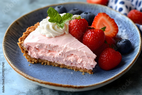 dessert, pie, cheesecake, strawberry, berry, blueberry, mint, slice, tart, pink, sweet, delicious, refreshing, summer, treat, food, baked, homemade, crust, topping, fruit, creamy, cool, refreshment, healthy, snack, party, gathering, celebration, seasonal, bite, plate