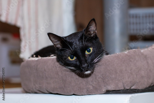 A small black cat with yellow eyes is curled up on a blanket near a window