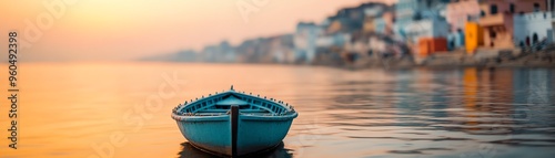 A small blue and red boat floats peacefully in calm water with a colorful town reflected in the distance.