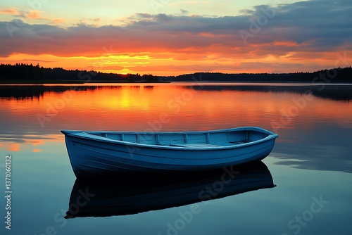 A small boat gently floating on a still lake at sunset, the sky ablaze with warm hues, creating a peaceful and serene atmosphere perfect for quiet reflection