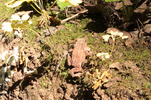 A small brown toad moves on the ground and moss in the spring forest