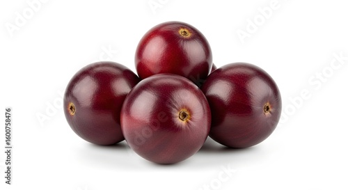 A small cluster of four deep red plump cranberries is artfully arranged on a clean white background showcasing their smooth texture