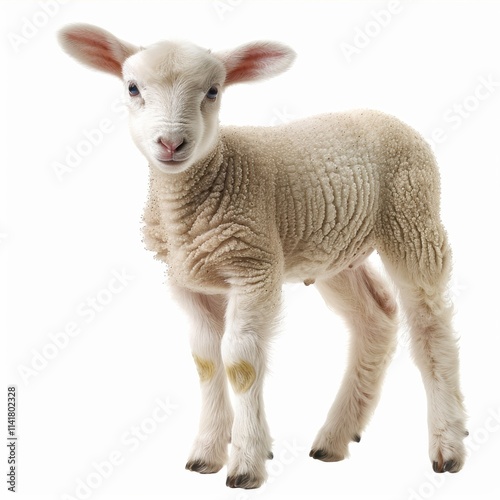 A small, fluffy lamb stands playfully, with soft white wool and large ears, exuding innocence and charm against a light background