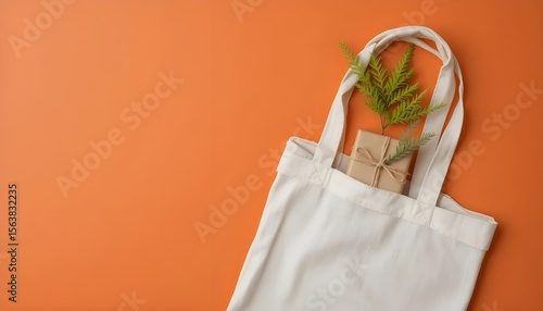 bag, tote, gift, present, box, package, fern, orange, eco, friendly, minimal, string, tied, brown, white, shopping, canvas, cotton, recyclable, plant, leaf, craft, hand-made, simple, still, life, studio, shot, table, surface