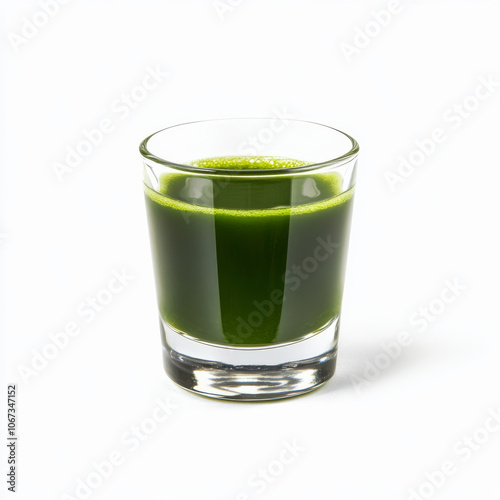 A small glass of fresh wheatgrass juice, isolated on a white background, emphasizing a nutrient-rich drink