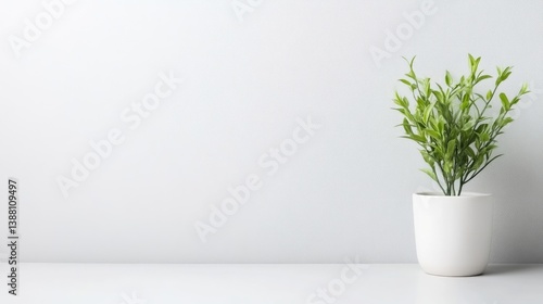 A small green plant in a white pot sitting on a minimalist shelf against a plain light gray wall, and simple and elegant indoor decor concept.