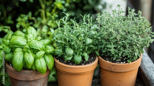 A small herb garden with fresh basil, rosemary, and thyme growing in pots