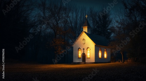 church, night, forest, dark, wood, tree, alone, isolated, building, religion, faith, hope, spirituality, light, illuminated, glow, window, cross, church steeple, peaceful, serene, quiet, calm, mystery, gothic, architecture, landscape, nature, scene, image, picture, photograph, evening, dusk, shadow, silhouette, mystical, magical, rural, countryside, country, chapels, small, structure, religious, belief, prayer, sanctuary, divine