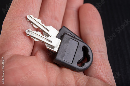 A small key with a plastic handle on a male hand. Accessories for opening school lockers.