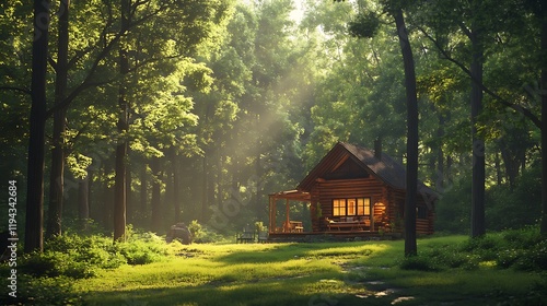 A small log cabin surrounded by vibrant green trees, soft sunlight filtering through the dense canopy above, creating a serene and natural retreat, ultra-realistic, hd quality,