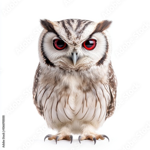 small, owl, red, eye, stare, camera, large, fierce, intimidating, bird, white, appearance, giving, fur, brown, animal, black, spot, face, wildlife, nature, beak, wild, predator, feather, portrait, night, closeup, hunter, orange