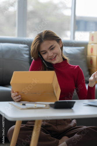 A small partnership business owner is using a mobile phone to contact customers online and a retail parcel box is checking a tech commercial delivery order on a mobile app. startup business ideas.