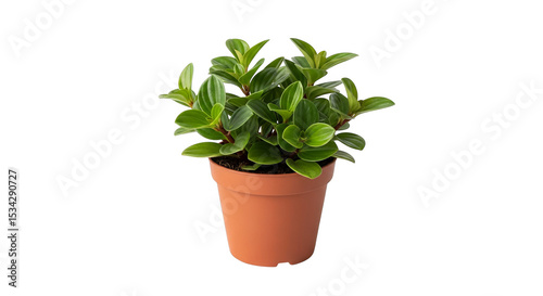 A small peperomia plant with vibrant green leaves sits in a terracotta pot on a dark background.