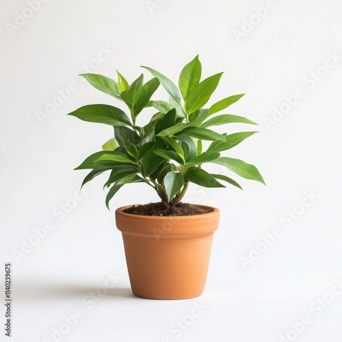 A small potted plant with lush green leaves and a simple clay pot on a white background