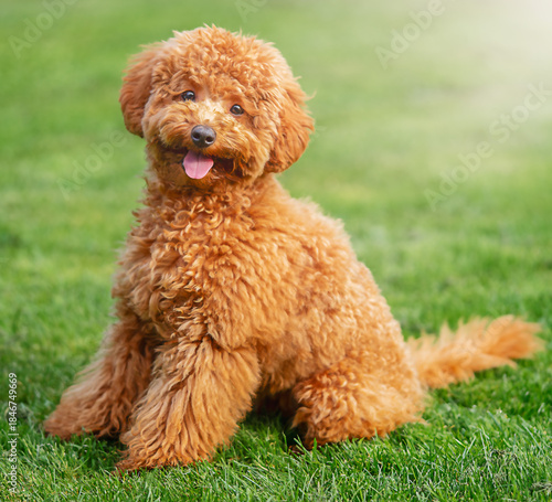 A small red curly dog ​​sits on a green lawn during a walk in the summer