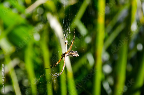 spider, spider's web, hunt, bug, small, animal, arachnid, close, spider's web, delicate, detail, green, insect, macro, natural, nature, silk, trap, web, wild, predator, leg, colours