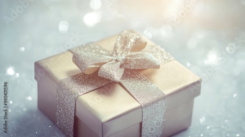A small, square gift box with a shiny bow, placed on a white background with soft lighting.
