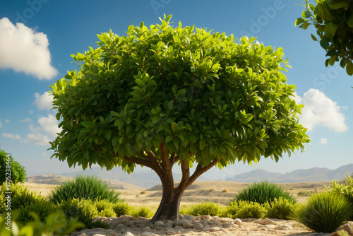 small, tree, middle, desert, landscape, green, nature, sky, mountain, sunny, cloudy, scenic, outdoors, environment, vegetation, tranquil, serene, large, leaf, center, rocky, ground, few, shrub, bush, surrounding, blue, white, cloud, scattered, across, background, clear, sun, shining, brightly, creating, warm, inviting, atmosphere, mood, scene, peaceful