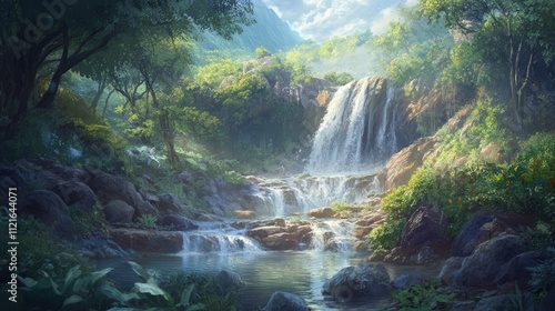 A small waterfall spills over jagged rocks, feeding a tranquil stream that cuts through the lush forest.
