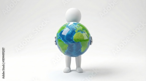 A small, white, 3D-rendered figure stands holding a detailed, vibrant globe of Earth in front of a plain white background.