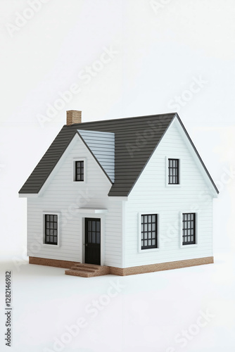 small, white, house, black, roof, window, model, chimney, door, step, siding, architecture, three-dimensional, rendering, design, home, sloping, left, side, porch, right, front, 2, ground, floor, center, wall, painted, window, second, covered, grey, shingle, staircase, leading, up, background, plain