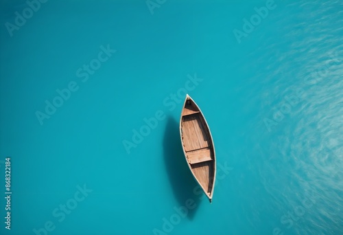 A small wooden boat floating on a vibrant turquoise ocean, with the boat's reflection visible in the water