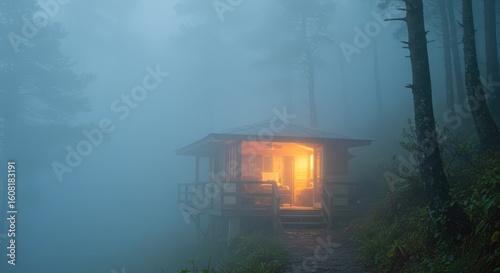 cabin, misty, forest, twilight, wooden, light, fog, path, tree, nature, mountain, wood, landscape, tranquil, calm, peaceful, quiet, mystery, solitude, secluded, hidden, warm, gold, illuminated, exterior, structure, cosy, rustic, elevated, pathway, foggy, night, dusk, scenic, silent, dense, green, still, enchanted