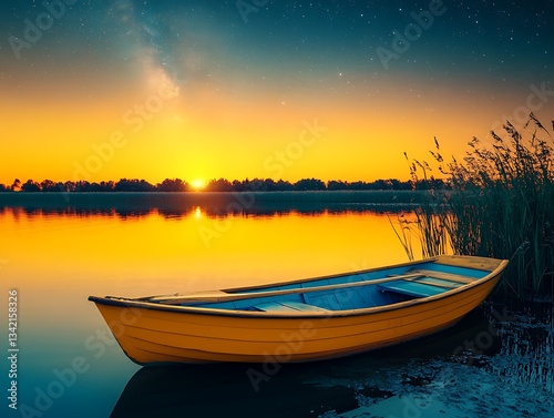 boat, water, lake, sunset, sky, yellow, cloud, orange, horizon, shore, reed, grass, tree, nature, evening, twilight, calm, serene, peaceful, dusk, colourful, light, tranquil, star, night, summer, outdoors, travel, vacation, ripple, stillness, scenic, composition, landscape, celestial, beautiful, dark, silhouette, dawn, gold, vibrant, backlit, background