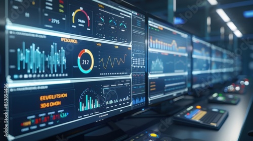 A smart city energy analytics dashboard showing real-time data on energy consumption and production, photorealistic, in a high-tech control room, emphasizing smart energy management.