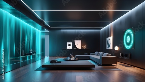 A smart home interface glowing on a glass wall in a futuristic living room