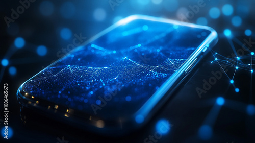 A smartphone displaying a digital network design with glowing blue lines and dots