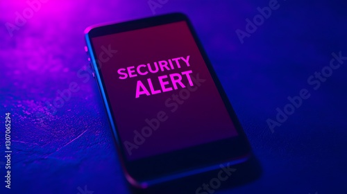 A smartphone displaying a glowing "SECURITY ALERT" message, set against a dark background with purple lighting.