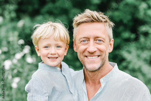 A smiling Caucasian man holds a young boy with blond hair. They are outdoors surrounded by greenery and flowers, enjoying a sunny day together.