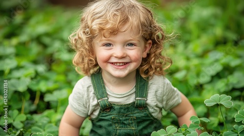 A smiling child with curly hair playing among lush green plants.