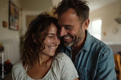 A smiling couple is sharing a joyful and affectionate moment at home, illustrating happiness, love, and a strong connection within a cozy and inviting living space.