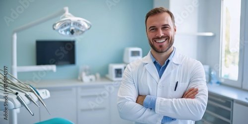 smiling, dentist, standing, clean, dental, office, doctor, health, medicine, hospital, clinic, health care, medicals, people, laboratory, patient, computer, business, professional, care, laboratory, person, scientist, occupation, stethoscope, working, work, man, coat
