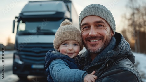 A smiling European father holds his young son in the foreground, with a semi-trailer truck in the background, showcasing industrial scenes of family, transportation, and logistics concepts.