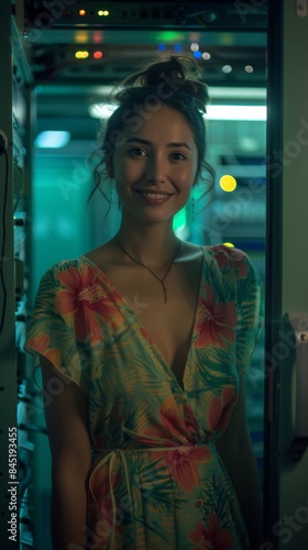 A smiling Hispanic woman, identified as an IT worker, standing confidently in front of an open refrigerator