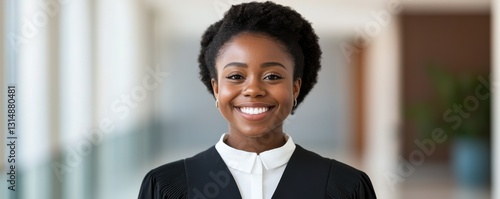 A smiling individual in a professional setting, wearing a black robe, exuding confidence and positivity.