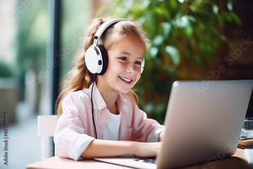 a smiling little girl in headphones having a video call distant class with a teacher using a laptop