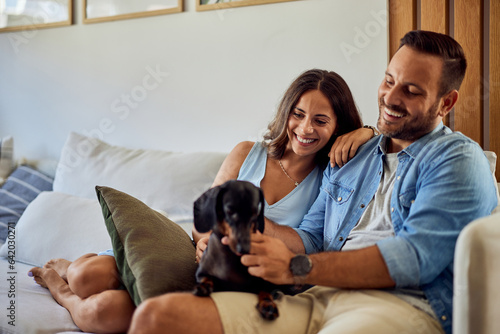 A smiling love couple cuddling their cute little dachshund dog at home.