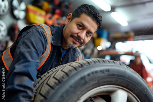 person, tire, human face, wheel, clothing, tread, man, smile, indoor, car, smiling, black, white, casual clothes, short hair, sunglasses, outdoors, car repair, mechanic, sunny day, urban setting, fashion, masculinity, strength, city life, avocation, relaxation, transportation