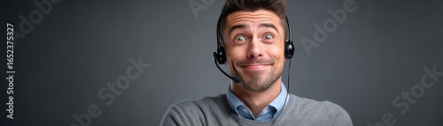A smiling man wearing a headset looks engaged and friendly, suggesting a positive customer service or communication role, HR Announcement with a blank space for text