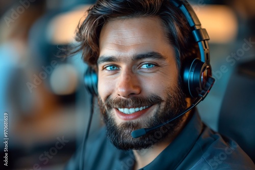 smiling, man, beard, headset, looking, camera, office, ai, generated, photo, stock, portrait, male, men at work, professional, casual attire, tech, technology, modern, workplace, cheerful, happy, bearded, call center, customer service, support, agent, employee, business, telecom, smile, expression, face, computer, desk, earphones, microphone, communication, cyberspace, remote, online, work, job, corporate, digital