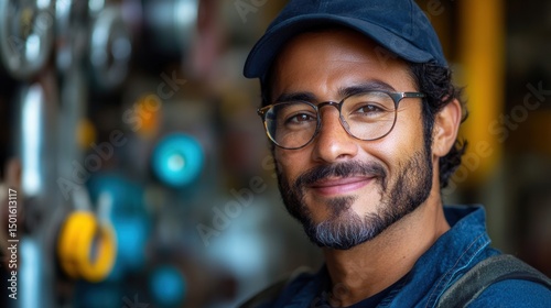 man, portrait, goggles, bearded, smile, workshop, happy, eye, cap, face, cheerful, looking, person, closeup, hair, close, adult, male, smiling, expression, positive, confident, head shot, studio, workspace, dark, sharpened, day, work, blue