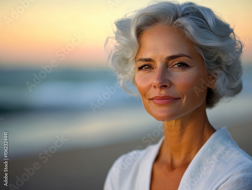 A smiling mature woman with white hair enjoys a serene moment at the beach during sunset, exuding contentment and peace.